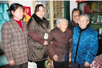 五代卫生委员在程瑜老人家中。(左起郑小平、叶娅娜、程瑜、应爱珍、吕素华)