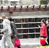 4月3日,扫墓的市民在杭州钱江陵园关注一种新颖的殡葬形式——壁葬。该园积极倡导 “绿色殡葬”,今年推出的壁葬,具有环保和节俭等优点。 记者 吴元峰 摄