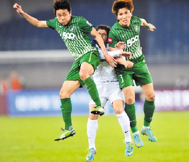 4月7日,杭州绿城队球员王林(左)、金东进(右)与上海申花队球员艾德华争抢头球。当日,在2013赛季中超联赛第四轮的比赛中,杭州绿城队主场以0比0战平上海申花队。 新华社发