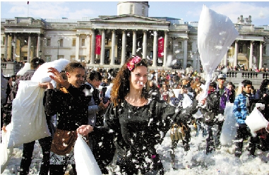 4月6日,人们在英国伦敦特拉法加广场参加“枕头大战”。当天,欧洲及美国多个城市上演了一年一度的“枕头大战”。 新华社发(高塔姆摄)