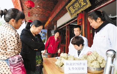 4月9日上午,位于永康市迎春路的春洲堂中医馆门前排起了长队,市民们正在免费领取防禽流感茶,4天来,一共发放了400多包。 永康日报记者 程卡 程娉婷 摄