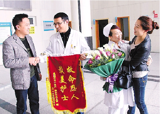 张海燕和丈夫给尹芸(右二)送来锦旗和鲜花。 吴森邦 摄