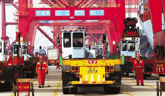 4月9日,在宁波港三期码头,工人正在为货轮装载集装箱货物。今年一季度,宁波港口货物吞吐量完成11510万吨,同比增长8.9%;集装箱吞吐量完成403.7万标准箱,同比增长9.3%。