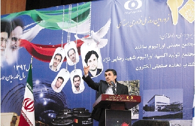 4月9日,伊朗总统艾哈迈迪-内贾德在首都德黑兰举行的国家核技术日庆祝活动上讲话。 新华社发