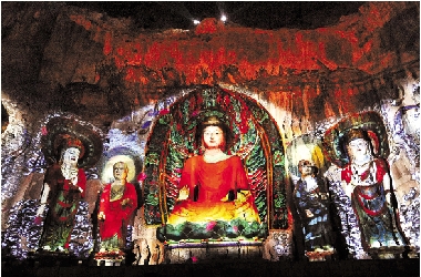 借助声、光、电等现代科技,龙门石窟景区的卢舍那大佛披上了红色袈裟(4月8日摄)。4月8日,洛阳龙门石窟景区“夜游龙门”项目正式对外开放。在千余盏灯饰装扮下,南北1公里的石窟遗存金碧辉煌,让游客充分领略了龙门石窟佛教造像的神奇风采。 新华社记者 王颂 摄 |