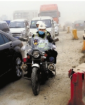 交警戴口罩在拥堵的路段执勤。
