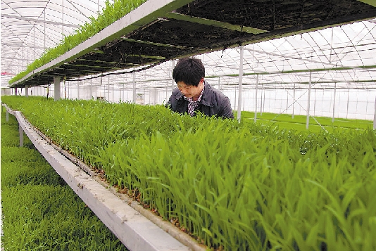 工厂化育秧大棚里秧苗青青。 刘元斌 摄