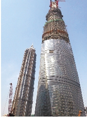 在建的国内第一高楼“上海中心”(右)(4月11日摄)。当日,目前在建的国内第一高楼、总高度632米的“上海中心”主楼核心筒结构浇筑完毕第108层,高度突破500米,达到501.3米。按计划,“上海中心”将于2015年全面建成并启用。 新华社发(丁汀 摄) |