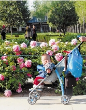 4月10日,在洛阳隋唐城遗址公园,一名坐在童车里的婴儿与绽放的牡丹相映成趣。4月的“牡丹花都”洛阳,春光明媚,在市内十几个牡丹观赏园以及洛阳市区的街道、公园、广场的绿化带内,各色牡丹争奇斗艳,吸引大批市民前来欣赏。 新华社记者 王颂 摄 |