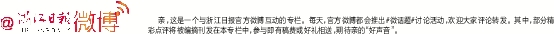 亲,这是一个与浙江日报官方微博互动的专栏。每天,官方微博都会推出#微话题#讨论活动,欢迎大家评论转发。其中,部分精彩点评将被编摘刊发在本专栏中,参与即有稿费或好礼相送,期待亲的“好声音”。