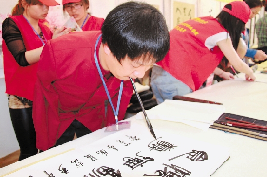 | 4月12日,第二十九届中国兰亭书法节在书法圣地绍兴兰亭开幕,来自重庆、云南、浙江等地被誉为全国书画“无臂七子”的陈伟强、丁京华等,当场作书画进行义卖,共筹集7万元,用于资助绍兴肢残人士和陕西渭南的贫困学生。 记者 金敖生 摄 |