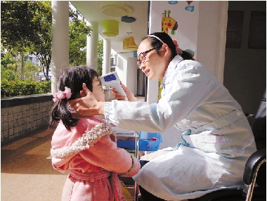 杭州江干区采荷三小教育集团督促同学们注意卫生习惯。图为医生正在给学生进行晨检。 通讯员 柳彬扬 摄
