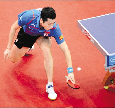 4月12日,在中国香港伊利沙伯体育馆举行的第26届亚洲杯乒乓球赛男子单打小组赛中,中国队选手许昕以4比1战胜中国香港队选手唐鹏。 新华社发