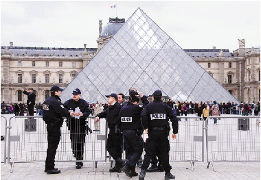 4月11日,警察在法国巴黎卢浮宫广场执勤。当天,卢浮宫在经历临时闭馆风波后重新开放,政府加强警力确保卢浮宫广场及博物馆内游客及工作人员安全。由于危害参观者和员工安全的偷盗行为日益增多,10日,200多名卢浮宫工作人员集体罢工表示抗议,从而导致卢浮宫临时闭馆一日。在得到政府和馆方加强安全措施的承诺后,罢工者同意恢复工作,卢浮宫于11日重新开放。 新华社记者 高静 摄 |