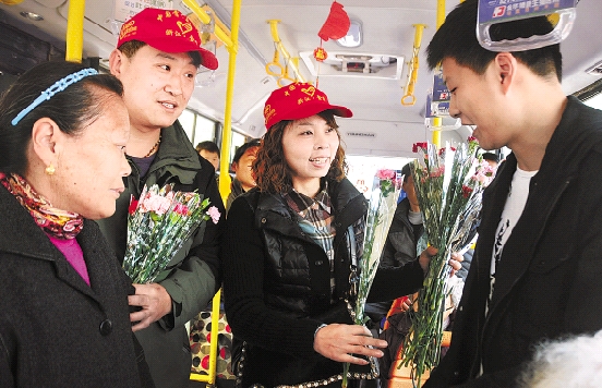 金华志愿者将鲜花送给让座乘客。 李建林 摄