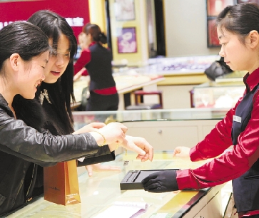 受国际黄金价格不断下跌影响,绍兴市区一些金店、银行等千足金价格不断下调,引来不少市民“抄底”抢购黄金。 王志成 摄