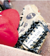4月15日,美国职业棒球大联盟费城人队球员里维尔的手套上贴着写有“为波士顿祈祷”字样的布条。