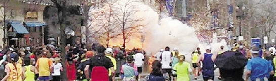 马拉松比赛选手跑向终点线附近时发生爆炸瞬间。 新华社发