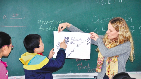杭州求是竞舟小学加强国际交流,让教室变成国际化的课堂。图为美国加州半岛国际学校教师为学生上课。 通讯员 刘笑笑 摄