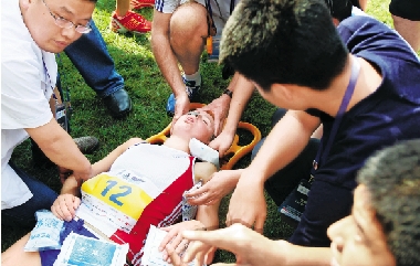 4月17日,现代五项世界杯成都站比赛在成都中国现代五项赛事中心开赛,由于当地气温高达30摄氏度,多名选手在参加跑射联项比赛中晕倒。图为工作人员在场边救治在跑射联项比赛中晕倒的法国选手巴尔托利。 新华社发