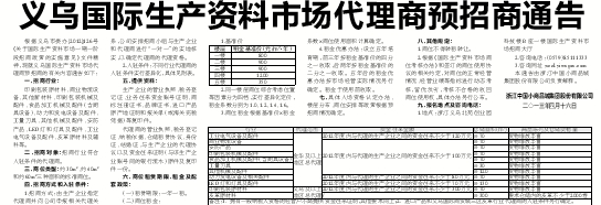 根据义乌市委办[2012]126号《关于国际生产资料市场一期一阶段招商政策的实施意见》文件精神,现就义乌国际生产资料市场代理商预招商的有关内容通告如下: