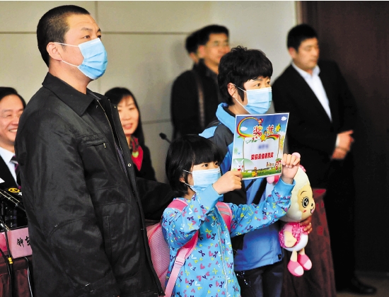 4月17日,在北京地坛医院,禽流感患儿姚某举起自己在医院得到的“最佳表现奖”奖状。 新华社记者 李文 摄