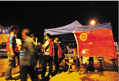 4月20日,雅安各高校青年志愿者正在为救援人员提供服务。