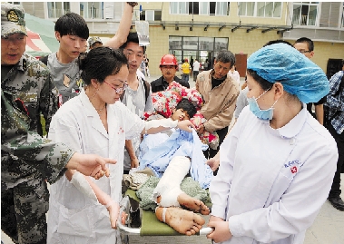 4月21日,芦山县人民医院,奋战在地震一线的医生、护士奋力抢救伤员。