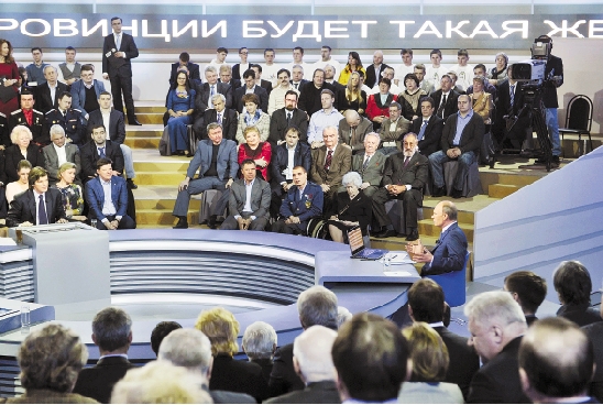 4月25日,在俄罗斯首都莫斯科,俄罗斯总统普京(右)在电视、广播和因特网直播节目中回答民众问题。 新华社发