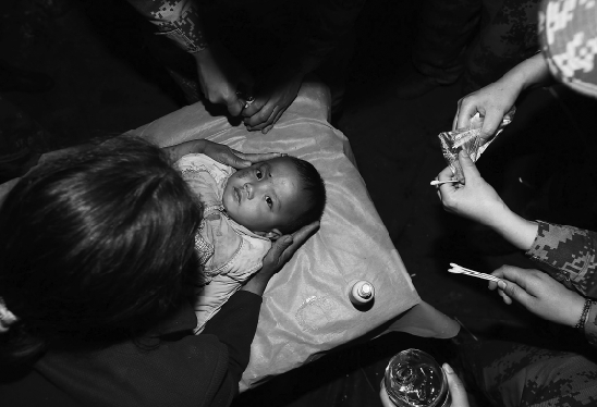 病床上等待做头部创口缝合手术的小伤员。