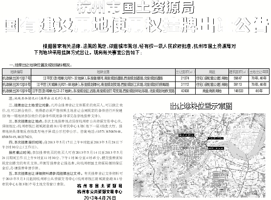 五、本次挂牌出让详细资料请参阅挂牌出让文件。有关挂牌出让文件资料可于2013年5月3日起到杭州市公共资源交易中心(杭州市钱江新城新业路311号市民中心L楼3楼)7号土地交易窗口索取。