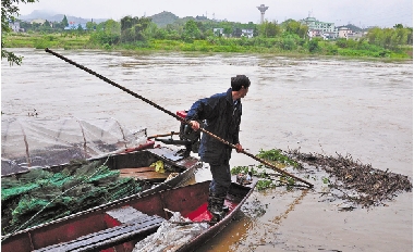 在江西省婺源县太白镇,渔民在降雨后清理杂物。 新华社发