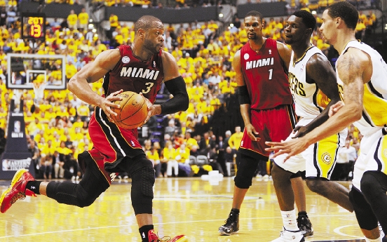 6月1日,热火队球员韦德(左)在比赛中持球进攻。 新华社发