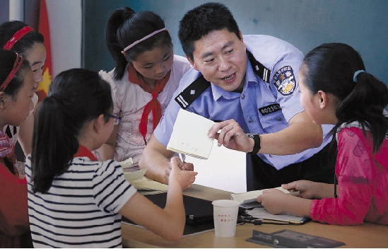 他在学校讲“以身试教”安全教育课,很受欢迎。课后,学生们将他当“明星”,要求签名留念。
