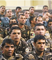 6月18日,在阿富汗首都喀布尔,阿富汗军人出席防务移交仪式。