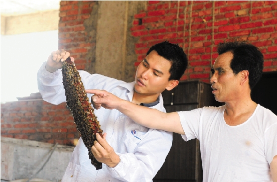 师徒查看蜜蜂健康状况。