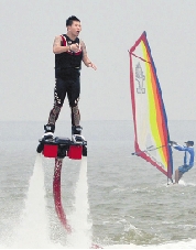 6月29日,一水上运动爱好者在天津东疆湾沙滩景区驾驶“海上飞行器”。据了解,该“海上飞行器”与摩托艇相连接,以摩托艇喷出的水为动力将人推向空中,驾驶者通过自身平衡来掌握飞行器行驶方向。 新华社发(周伟 摄)