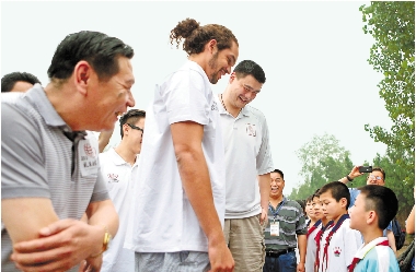 6月30日,姚基金发起人姚明(左三)与美国NBA芝加哥公牛队球星诺阿(左二)探访北京民工子弟学校——昌平汇蕾学校,与小球员交流互动。 新华社发