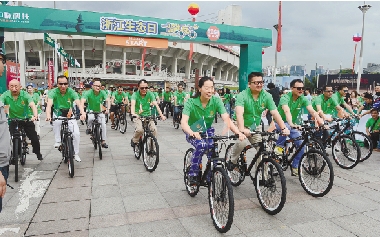 在世界游泳冠军罗雪娟(中)领骑下,“一骑出发千人行”巡游活动从黄龙体育中心出发。 潘良干 摄
