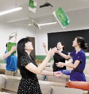 考试结束,李玉芳(右二)和姐妹们开心地把书高高抛起。