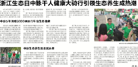 同时,据了解,今年已经是中脉第二次在杭州举办浙江生态日千人骑行活动。“中脉是业界率先提出生态养生理念的企业,这与浙江生态日所倡导的绿色、环保、健康的理念如出一辙,这也是中脉连续两年在杭州举办健康骑行的原因所在。”周希俭表示。