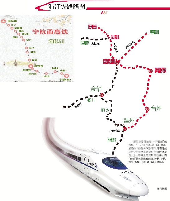 浙江铁路目前是“一环五射”的格局, “一环”是杭甬、甬台温、金温、浙赣构成的省内铁路环网,等在建的杭长、金丽温高铁明后年相继建成后,这一环将全部实现高铁化。而“五射”是五条出省通道,沪杭、宁杭、宣杭、浙赣、沿海(甬台温+温福)。