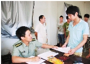 7月9日下午,临海市河头镇夏季征兵目测工作顺利结束,符合征兵条件的860名有志青年报名参加。黄三村的姚力天,受到正在服兵役的哥哥影响,积极报名应征。图为镇人武干部将体检通知书交给姚力天。
