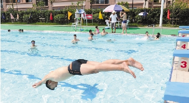 7月9日,萧山区衙前镇凤凰村一些村民和孩子在新建的游泳池游泳。这座崭新游泳池7月8日投入运营,由村投资800多万元建设,包括一个标准游泳池和两个儿童戏水池。 记者 吴元峰 摄