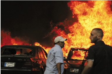 7月9日,在黎巴嫩首都贝鲁特南郊,人们在爆炸事件现场查看。黎巴嫩通讯社9日报道,黎巴嫩首都贝鲁特南郊当天发生爆炸,造成53人受伤。 新华社发
