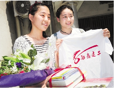 7月10日上午,家住杭州萧山区的陈钰凡同学(左)收到了浙江工业大学寄出的大学录取通知书,这是我省首份本科高校招生录取通知书。