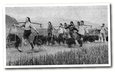 桐庐南堡大队党员干部挑肥到田头。