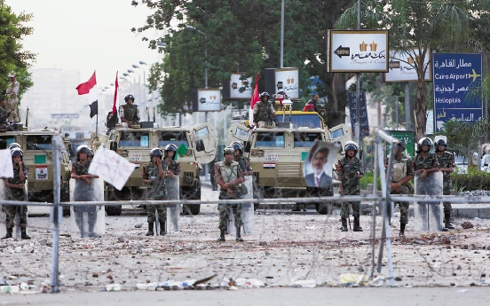 7月9日,在埃及首都开罗,士兵们在共和国卫队总部外警戒。 新华社发