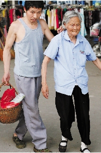 妈妈的眼睛是孩子的眼睛,孩子的力气是妈妈的力气。出门买菜,母子俩发挥各自的“长处”。