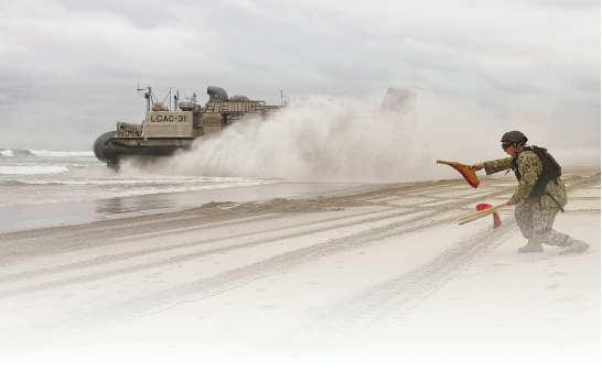 当地时间6月24日,日本自卫队在美国参加代号为“黎明闪电”的日美联合夺岛演习,图为士兵在演习中给LCAC气垫船打信号。 视野网供图
